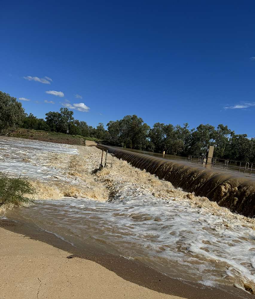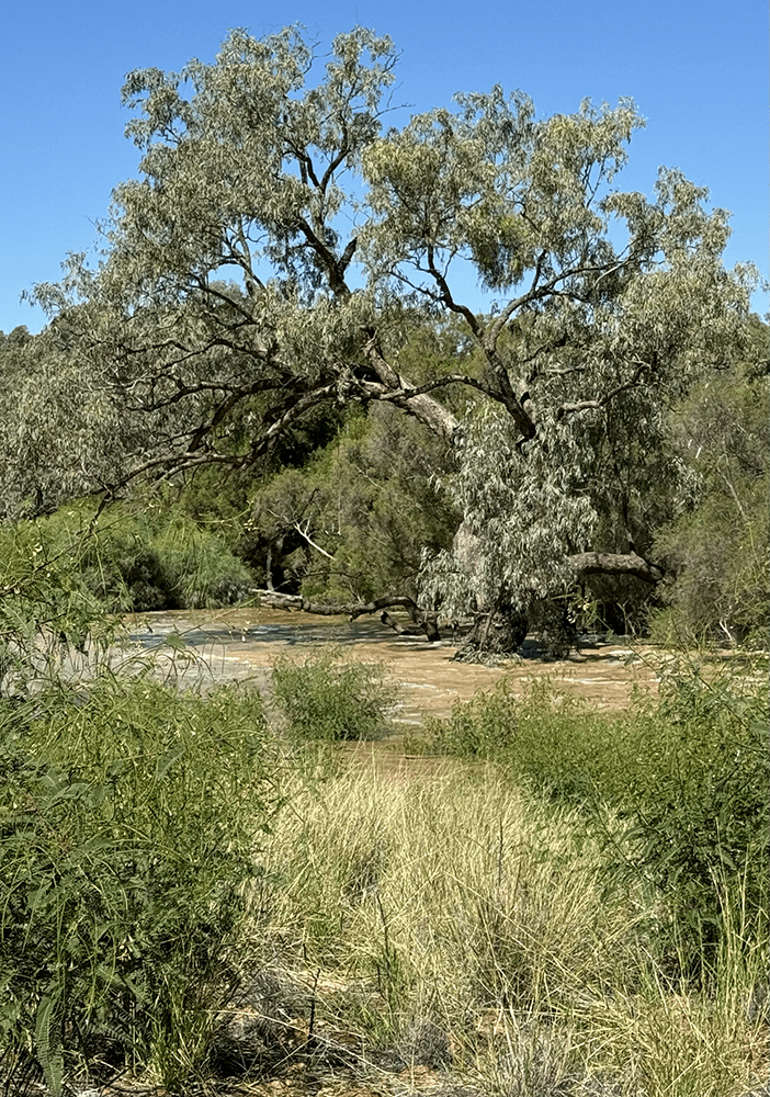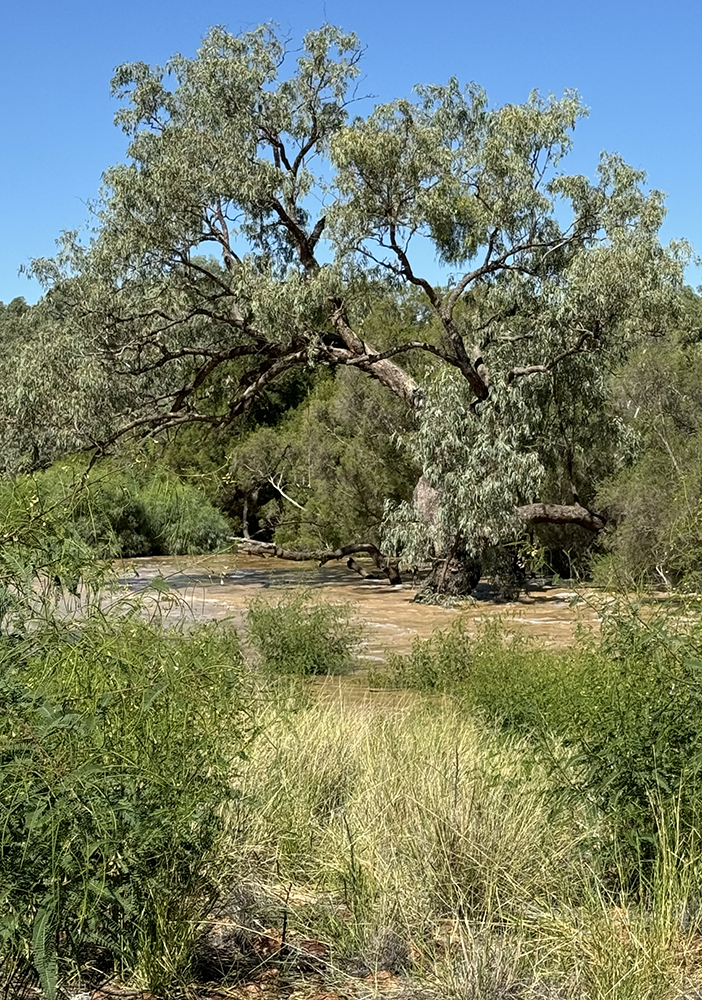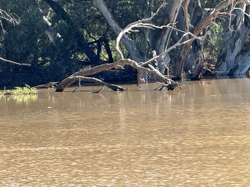 I am taken by the contrast between the rippling water and the sculpture of the deadwood/driftwood along the edge of the Warrego.