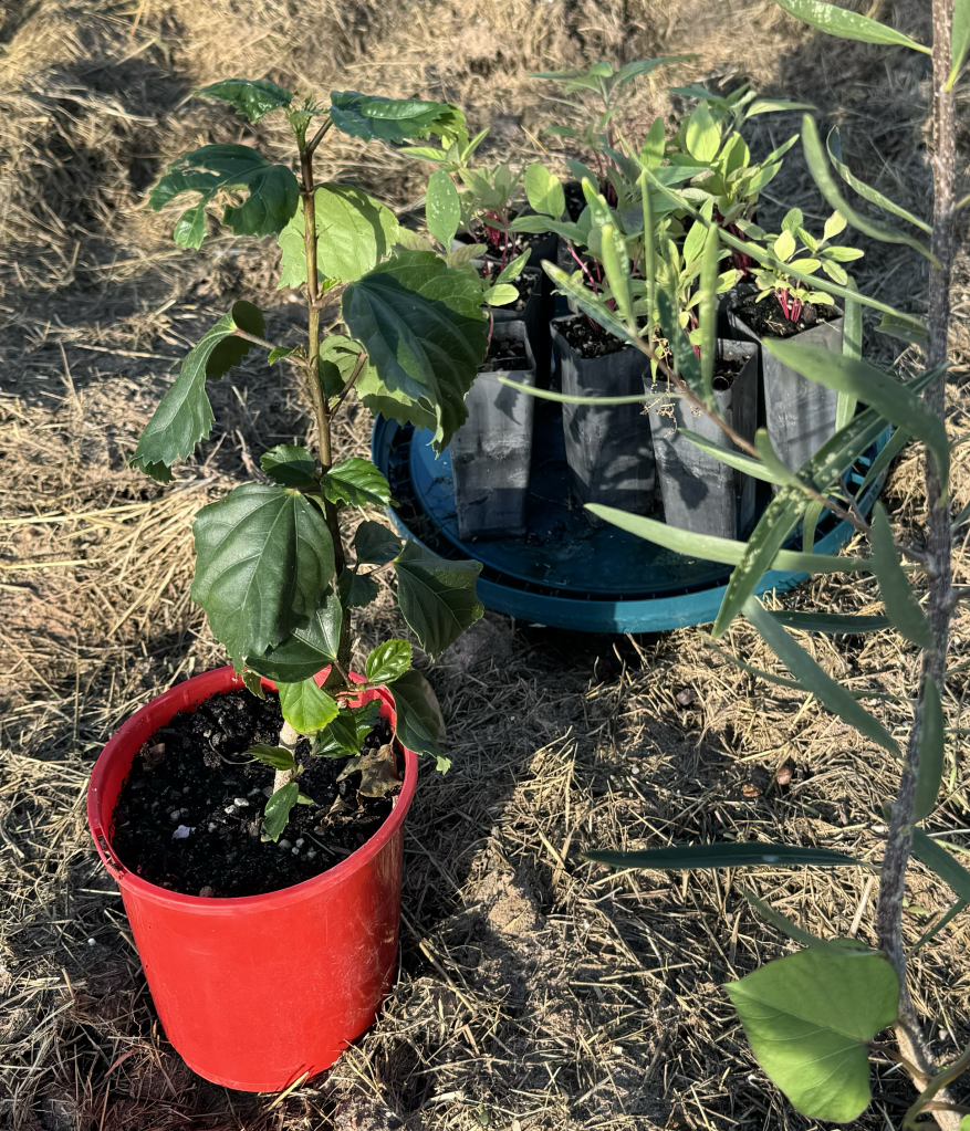 As always, I was keen to know all about the plant and its properties. As I returned to the car from picking up some seeds, I noticed hibiscus growing at RESQ. So, I asked about getting a plant. Here it is! You can see the Amaranthus seedlings behind it. You can see a Gumbi Gumbi to the side.