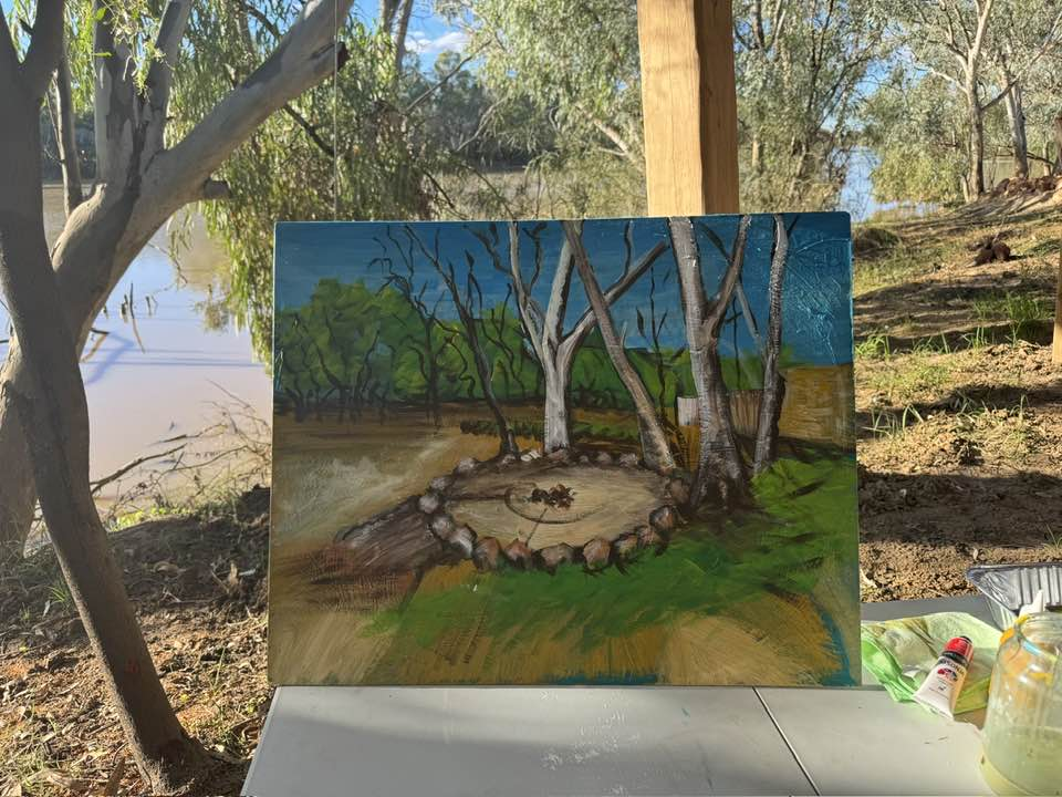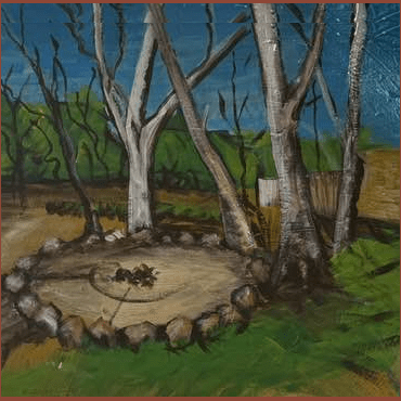 I was surprised when this painting emerged on the canvas as it was not what I intended to paint!. But the circular structure attracted me. This is the underpainting. The one an artist does when planning out a painting, I will glaze this here in my unit and then go back out next weekend to put the reflections and leaves into the mix.